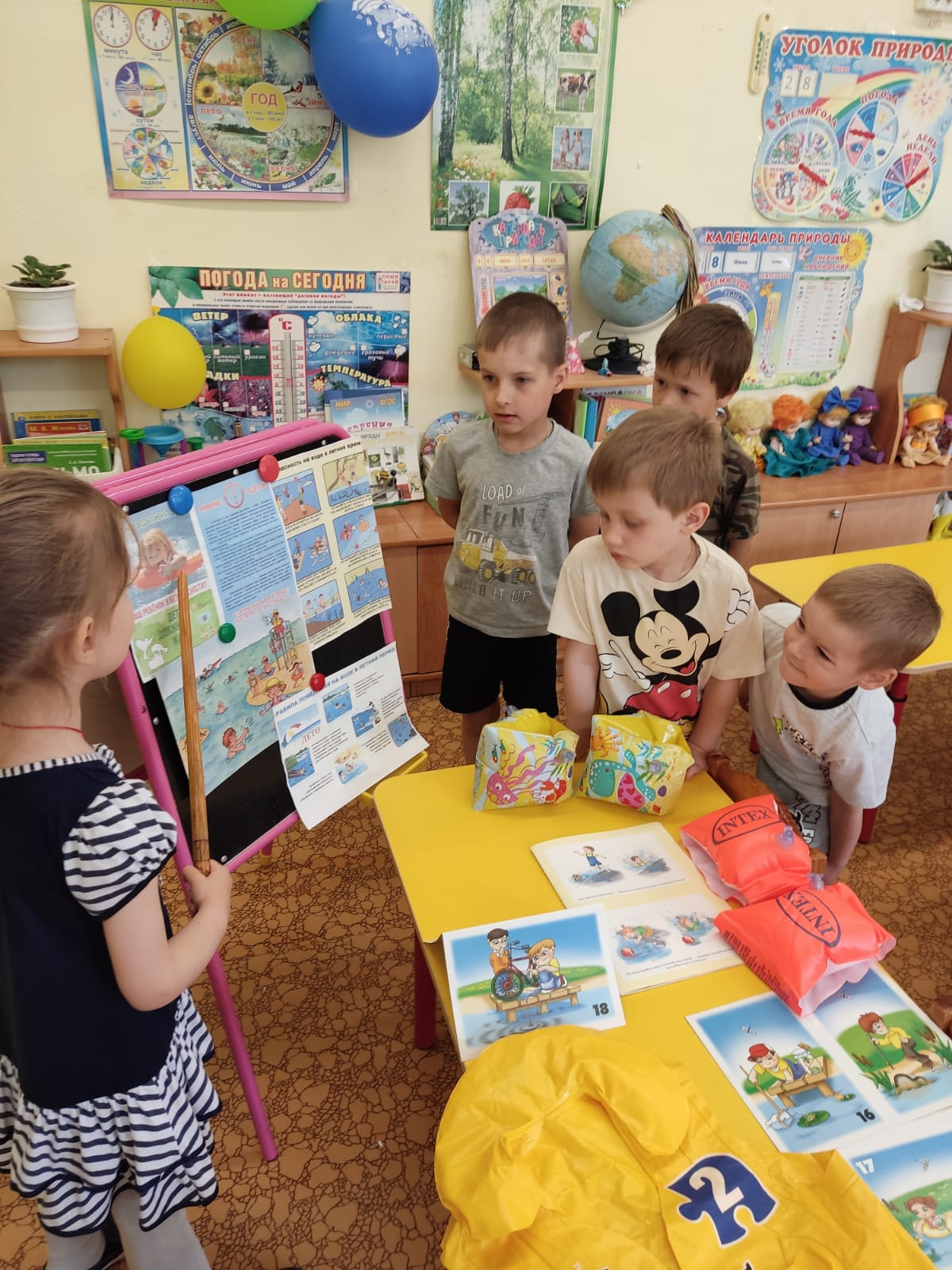 Ирина Алексеевна Бучкова познакомила ребят со спасательными средствами, рассказала и показала, как ими пользоваться, как правильно вести себя на воде во время купания и как помочь другу, если случилась беда. Также рассказала, какие водоемы открыты для купания в нашем районе.