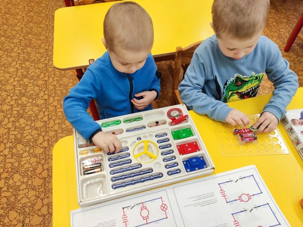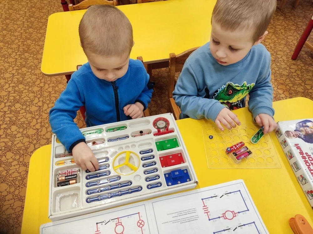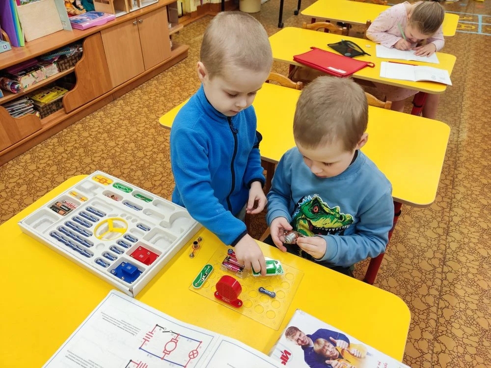 Наши юные гении группы "Сказка", используя электронный конструктор "Знаток" собрали простейшую электрическую цепь, узнали, при каких условиях лампочка загорается. Собрали и электрический вентилятор, и звонок!